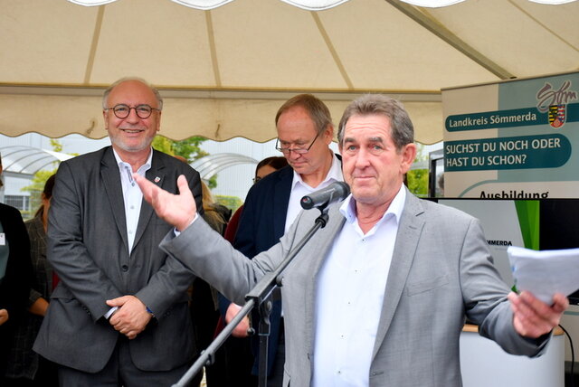 Bürgermeister Ralf Hauboldt drehte gemeinsam mit Landrat Harald Henning und dem Bürgermeister der Stadt Kölleda, Lutz Riedel, eine Runde über das Ausstellungsgelände, um persönlich mit Ausstellern und Unternehmen ins Gespräch zu kommen.