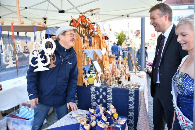 Strahlender Sonnenschein begleitete den Bauernmarkt am vergangenen Samstag in der Innenstadt. Der Eröffnung durch den 1. Beigeordneten Christian Karl sowie Stefan Schmidt, Abteilungsleiter Kultur, und der Waidprinzessin Eileen I. folgte ein Unterhaltungsprogramm auf der Bühne. Gestaltet wurde es vom Lindenberger Blasmusik e. V., dem Heimatverein Wenigensömmern mit seiner Trachtentanzgruppe, Nora Louisa - Schlagersängerin aus Dresden - sowie den Hot Banditoz.