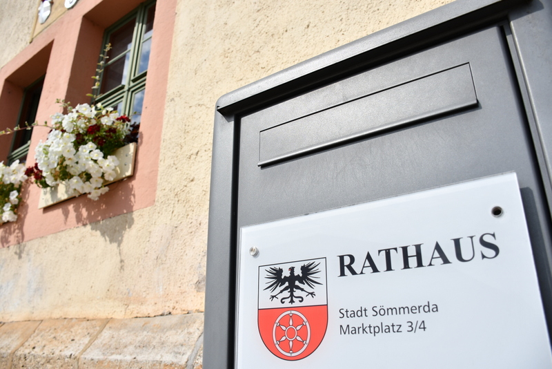 Ein Ausschnitt der Fassade des Rathauses mit Blumenkästen n Fenstern und dem Briefkasten in Edelstahl-Ausführung. Daran ist ein Schild mit dem Stadtwappen von Sömmerda und den Wörtern Rathaus Stadt Sömmerda, Marktplatz 3/4 angebracht.