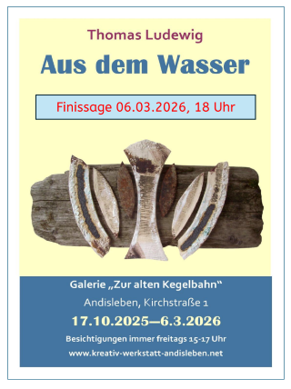 Am Freitag, den 06.03.2026 findet in der Andislebener Galerie „Zur alten Kegelbahn“ die Ausstellung „Aus dem Wasser“ von Thomas Ludewig ihren Abschluss. Somit besteht bis dahin noch Gelegenheit, die abwechslungsreichen Assemblagen aus Holz und Keramik zu betrachten und vor Ort ins Gespräch zu kommen. Nicht selten verwendet der Künstler neben Hölzern aus dem Wald auch Schwemmholz, das das strömende Wasser veränderte. Die zu brennenden Keramikscherben sollen das Holzstück „ergänzen“. Die Veranstaltung beginnt um 18 Uhr und jeder ist dazu herzlich eingeladen.